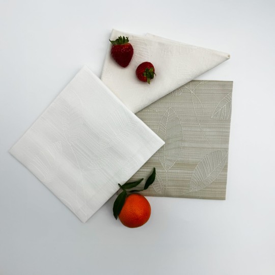 La Linea Aloe è progettata per ristoratori che desiderano offrire ai propri clienti un’esperienza di alta qualità, combinando praticità e stile. Questa linea si distingue per una texture raffinata impreziosita da un delicato ricamo a motivi di foglie, perfetto per ambienti eleganti e accoglienti.